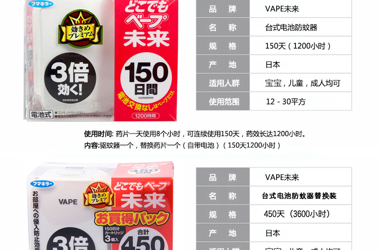 商品名称:日本未来(VAPE)台式静音电池驱蚊器3倍效果150日 孕妇婴儿用