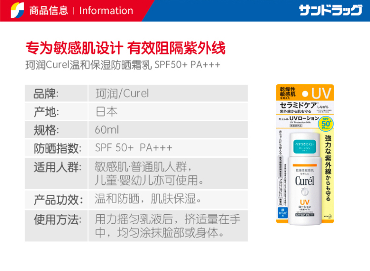 商品名称:Curel 珂润润浸保湿温和防晒乳液(SPF50+ PA++++ )60ml