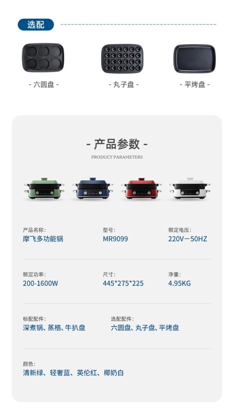 摩飞多功能锅5L升级版MR9099(白)(深锅+牛扒盘+蒸格+丸子盘+六圆盘+平烤盘)