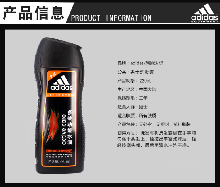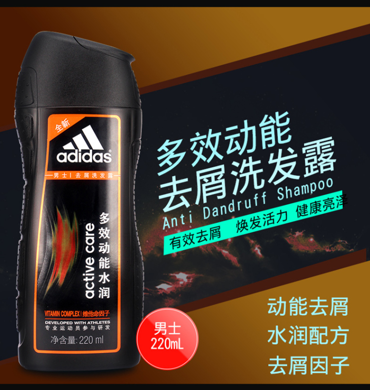 商品名称:阿迪达斯男士多效水润去屑洗发露220ml(有效减少头屑)