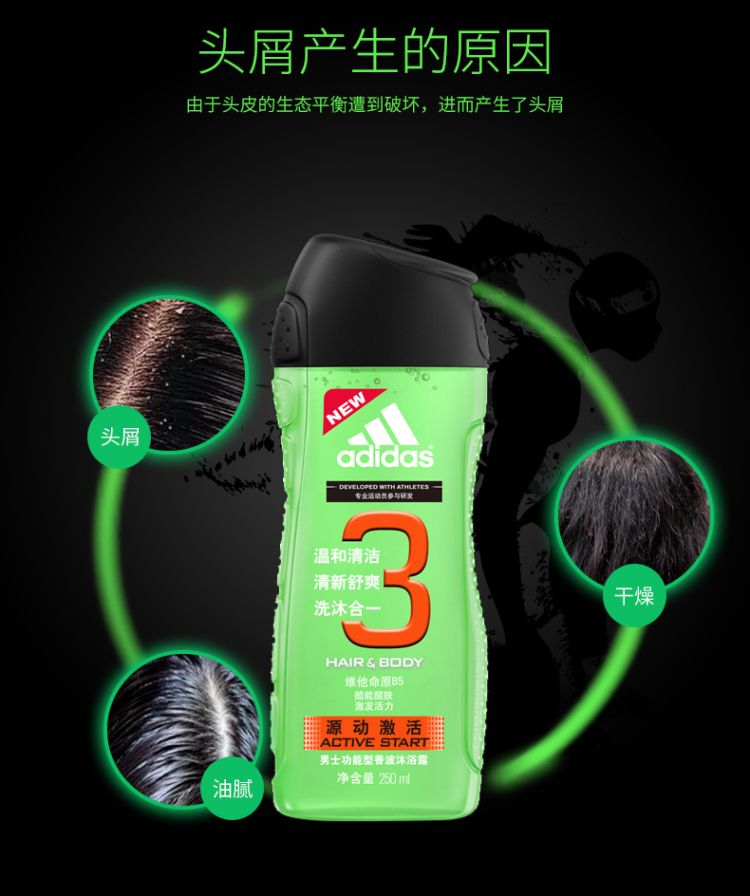商品名称:阿迪达斯男士沐浴露250ml-源动激活(温和清洁 洗发沐浴二合一)