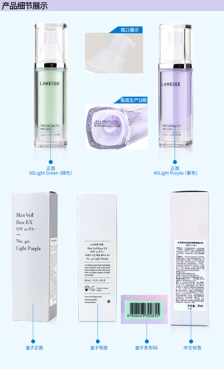 商品名称:韩国进口兰芝(LANEIGE)雪纱丝柔修颜隔离霜40号 (紫色)30ml (遮瑕,提亮肤色)